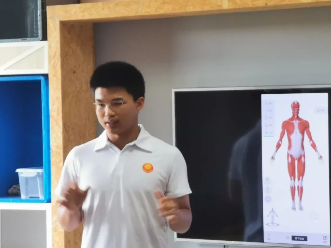 7月6日早9:00整,华泾社区“知行合益”暑期小讲堂第一次课开讲啦!本次课题为人体解剖学,龚泽瑞并没有采用传统的PPT做科普报告的方式,而是利用维萨里3D解剖学软件资源,制作清晰易懂的模板,在演讲过程中通过3D投屏辅助讲解,使得听众对于身体结构的空间位置和空间概念有了更清晰的认识。