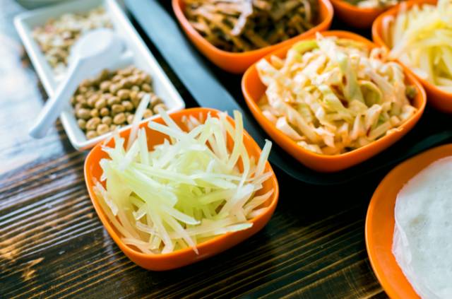 五颜六色的蔬菜切成细丝整齐码放成一排,这阵仗足以吸引每一位路人的眼球。