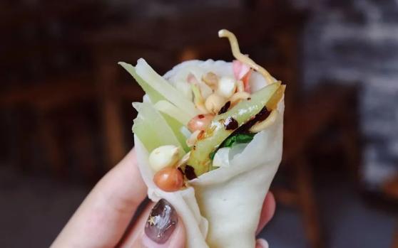 左手摊开一张小面皮,右手拈起几根黄瓜丝、豆芽、凉面放上,然后用面皮紧紧包裹,在蘸水里蘸一下,放上几颗油炸得酥脆的黄豆,折耳根入口一股泥土的清香的味道还有鱼腥味,丰富的味觉在嘴里蔓延开来。