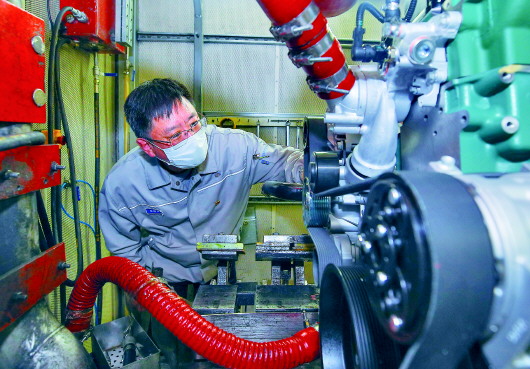 2020年5月7日,鹿新弟在车间检查柴油机的运行状况。 新华社记者龙雷摄