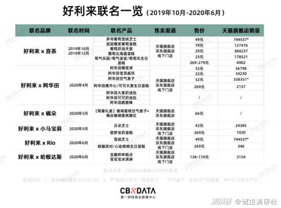 据CBNData消费站报道,截至2020年7月2日,半年多时间里好利来已经和6个品牌/IP推出20多款联名新品。其中不光有喜茶、阿华田、Rio等食品饮料品牌,还有动画IP小马宝莉,美妆品牌橘朵。“琥珀消研社”日前还发现,今年还多了和泡泡玛特、布朗熊、川宁、乐乐茶的联名。