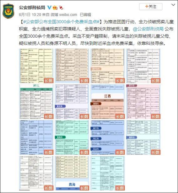 6月1日,公安部曾通过新闻媒体等渠道公布全国3000余个免费采血点。采血不受户籍限制,呼吁未采血的失踪被拐儿童父母、疑似被拐人员和身源不明人员,尽快到附近采血点免费采集,依靠科技寻亲。