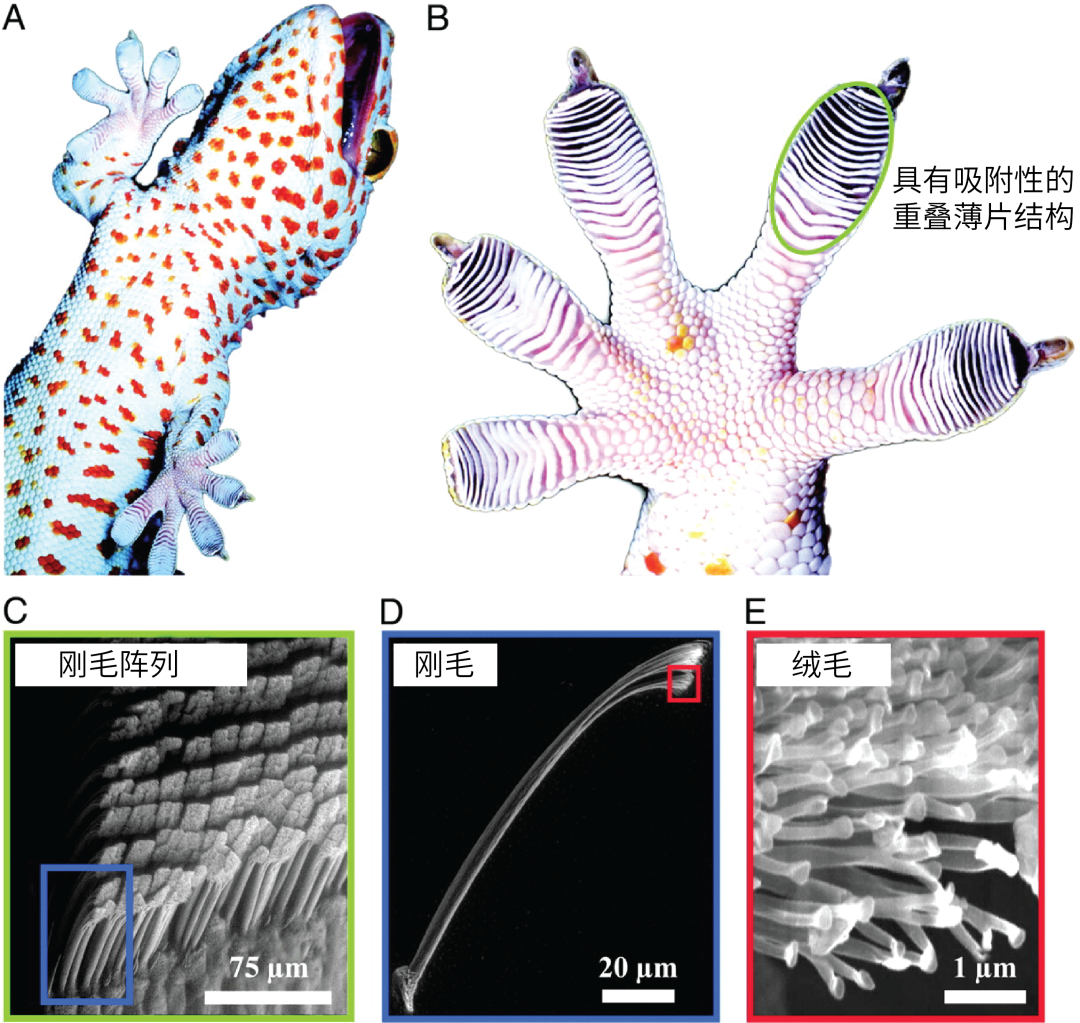 科学家们对大壁虎(Gekko gecko)的研究发现,壁虎的脚掌并非平坦光滑的,没有粘液,也没有吸盘。相反,脚掌上充满了褶皱,每只壁虎的脚有5个趾头,每个趾头上有大约20个重叠薄片结构(lamellae),每个层状结构都是由直径约5微米、长约110微米的刚毛(setae)构成,而在每根刚毛的末端则又分出了100-1000个长约200纳米的绒毛(spatula),而这些一级一级的结构共同组成了壁虎脚掌吸附系统的精细结构。