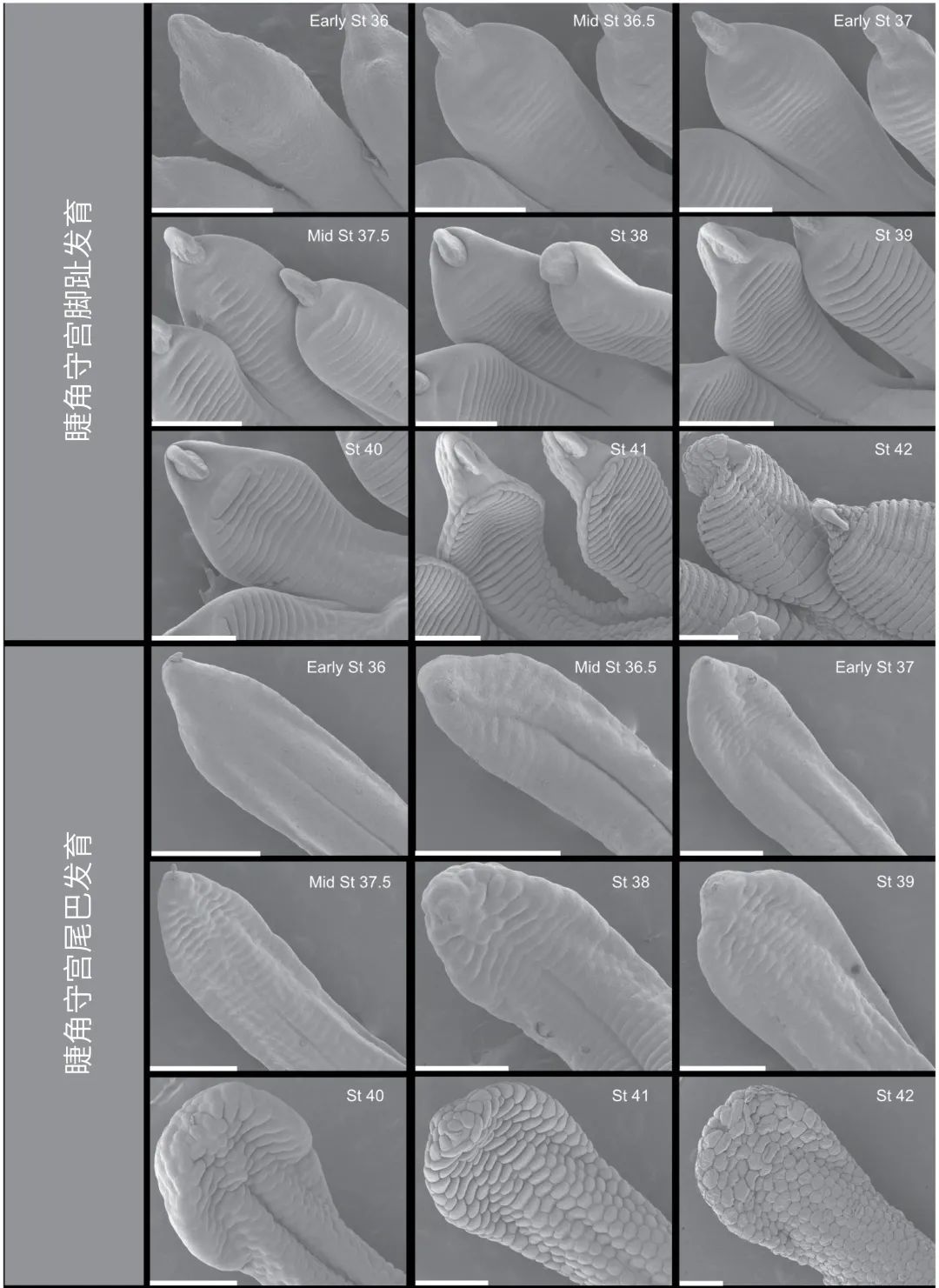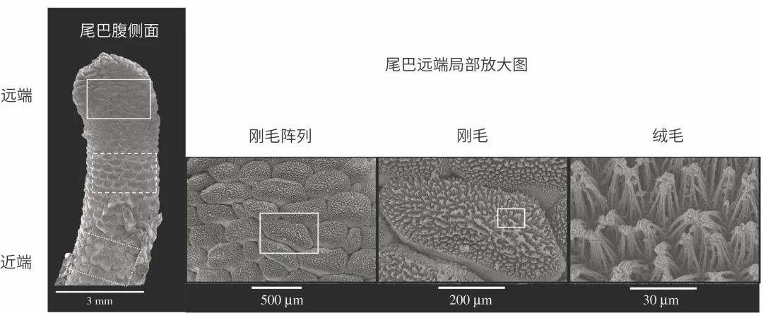 睫角守宫依靠尾巴倒挂 | 参考文献[5]尾巴上的吸附结构是什么时候产生的呢?研究者们通过对睫角守宫胚胎发育中脚趾和尾巴进行扫描电镜成像,为我们完整地展现了尾巴吸附结构的产生过程。尾巴尖的形状在整个发育过程中出现了很大的变化,起初是尖尖的,而后末端逐渐变得宽且钝。尾巴上吸附垫的发育与脚趾吸附垫的发育同步,并且发育过程中经历的主要步骤都非常相似。从演化角度来讲,科学家们认为尾巴吸附垫与脚趾吸附垫可能具有系列同源性,就像人类的胳膊和腿是同源的。