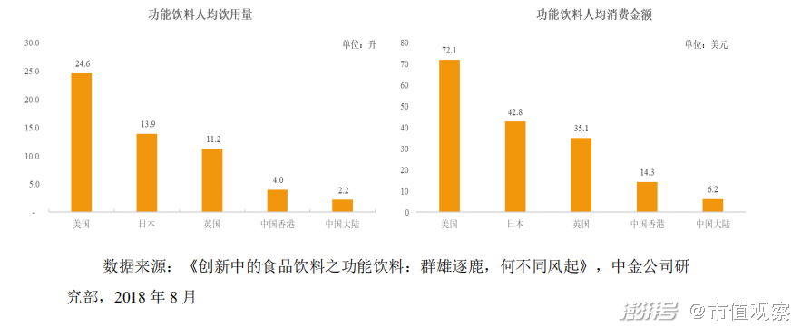 据统计,2014年到2019年,国内饮料行业复合年均增长率为4.46%,在功能饮料领域增速高达14.1%。而从人均消费金额和消费类分析,国内功能饮料消费水平还很低,仅占国外发达国家的10-20%左右。