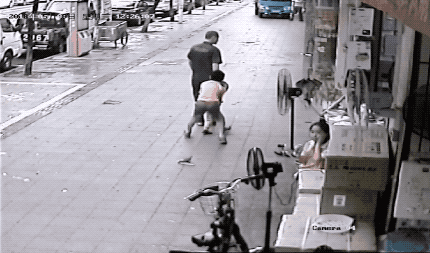 还有更触目惊心的。一位穿蓝色短袖的男子,他原本正和孩子散步。
