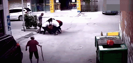 这些人把画面中可怜求救的父亲扑倒在地,殴打他,并且大声地叫喊着:“抓坏人啦,坏人抢孩子啦!”