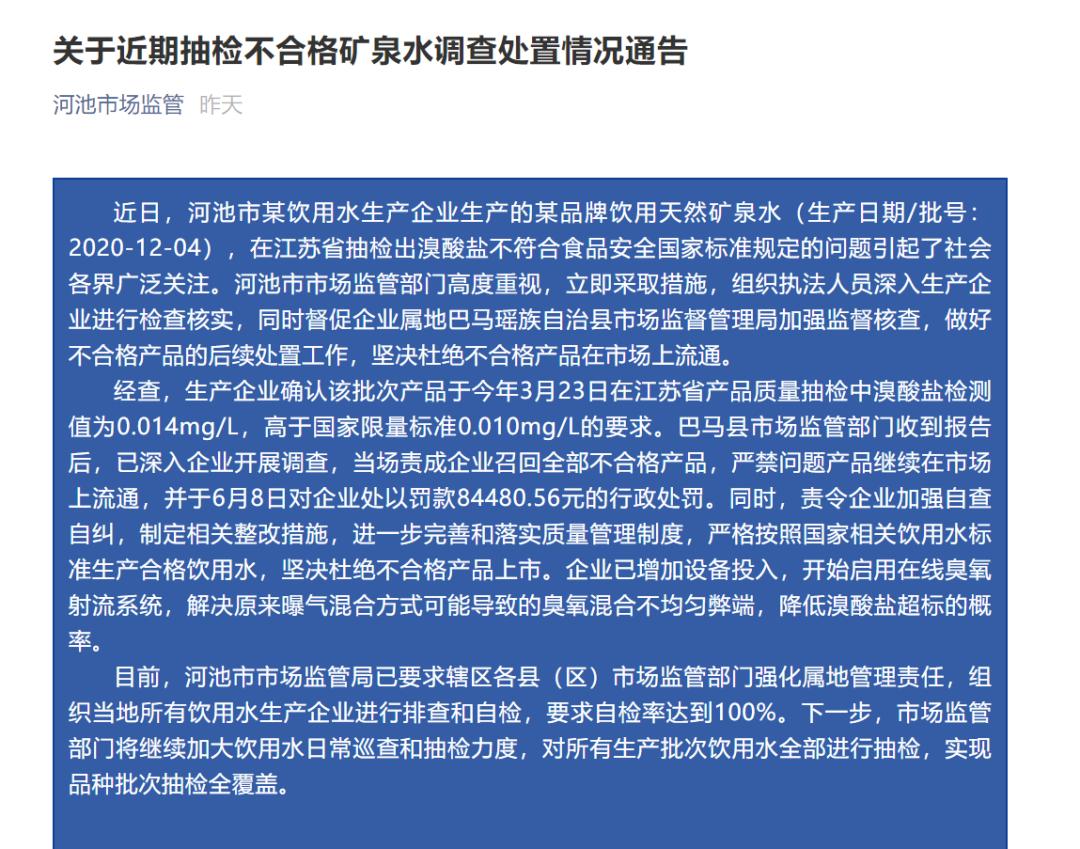 7月13日,河池市市场监管局在微信公众号发文,对此事进行通报。通报称,“巴马丽琅”有一批次矿泉水(生产日期/批号:2020-12-04)在江苏省被抽检出溴酸盐不符合食品安全国家标准规定的问题,引起了社会各界广泛关注。