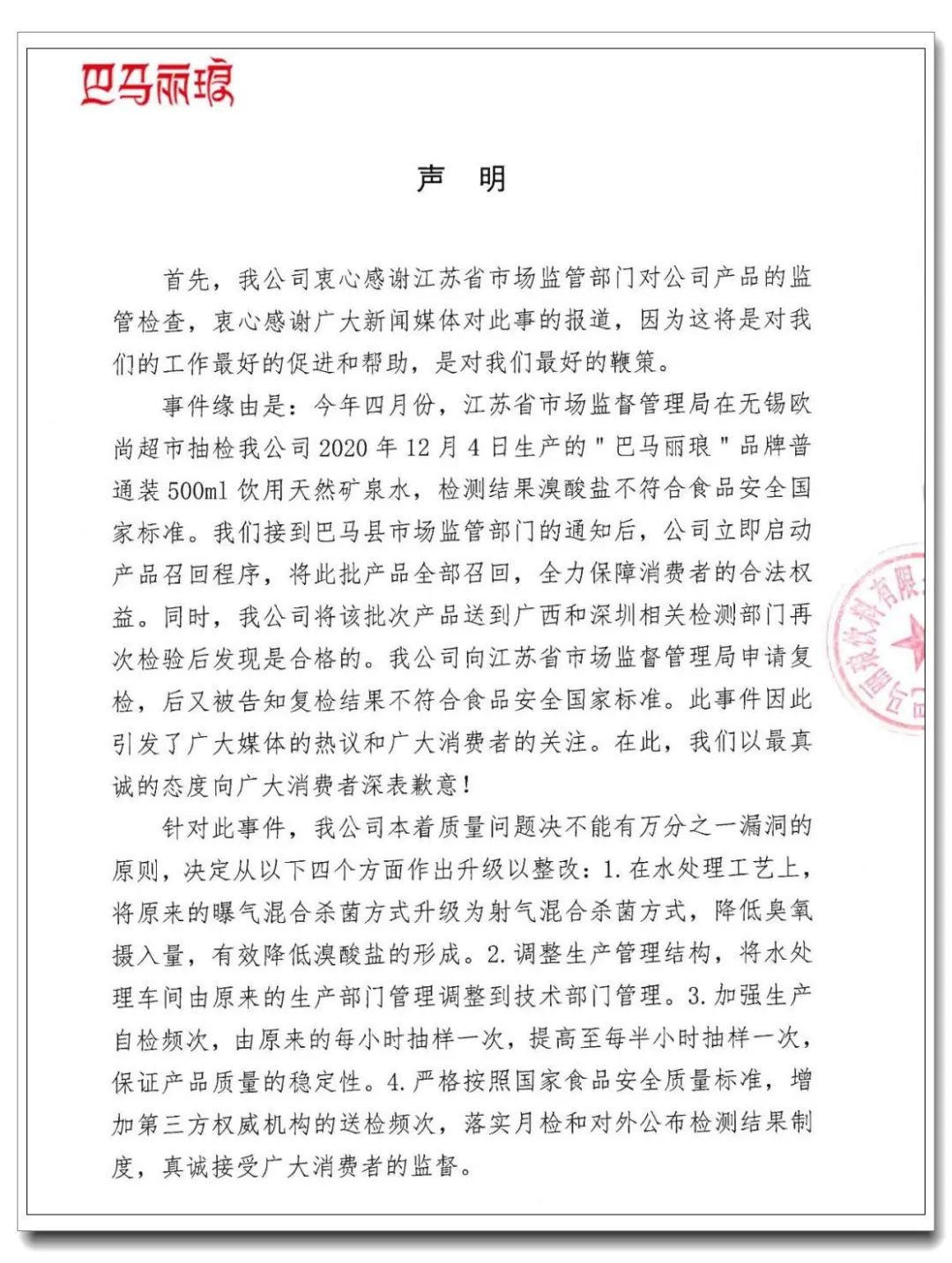 近日,江苏省市场监督管理局通报称,“巴马丽琅”矿泉水不符合食品安全国家标准。对此,“巴马丽琅”矿泉水所属公司广西巴马丽琅饮料有限公司发布声明,决定从四个方面作出升级整改。