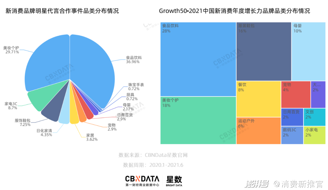 以品类为轴,CBNData发现食品饮料与美妆个护两大品类的代言事件占到统计周期内总数量的67%。这一统计结果与品类赛道的市场空间也保持了一致。近期发布的Growth50•2021中国新消费年度增长力品牌评选中,食品饮料与美妆个护的品牌的数量占比远居前列,分别达到28%和15%。可见,在竞争激烈的赛道,明星代言合作成为新消费品牌的常规操作。