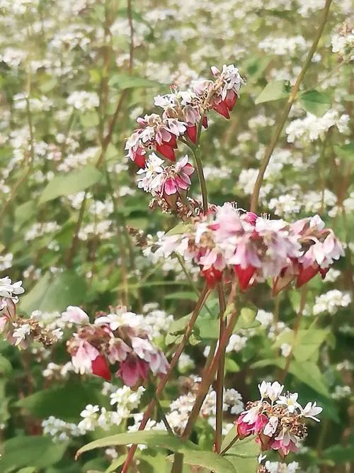 荞麦花开初秋,当你行走在沙圪堵的田间地头,无论是在平坦的沟里,还是在海拔稍高的梁峁地上,总会遇见花儿绽放的荞麦,蜜蜂在其上面飞起飞落,唱着“嗡嗡嗡”的小曲儿,一幅生机勃勃的画面。这时玉米棒颗粒已变得饱满、糜子谷穗已下垂……大地呈现出一片微黄,而荞麦才焕发出最美的容颜、才进入最佳的生长期。等庄稼人开始掰玉米、刨土豆,田间地头到处一片丰收景象时,荞麦也可以收割了。即使不是丰调雨顺的年景,它的收成也差不到哪去,荞麦就是这样生长期短、耐旱耐瘠。