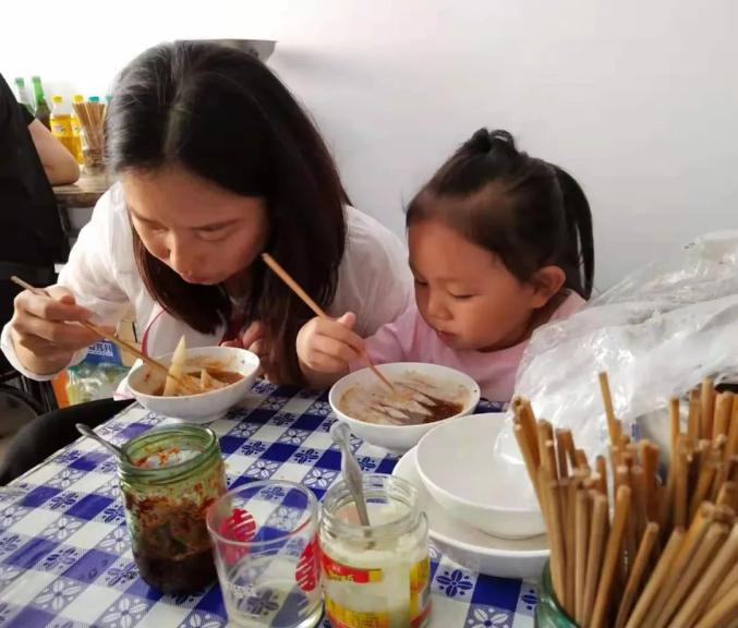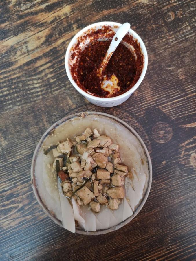 沙圪堵碗托。杨磊摄吃碗托,吃的不仅仅是碗托,更吃的是一种氛围、一种情怀。一些年长的碗托店,店面不大,走进去一看,地面上放一个长条桌。店主坐正中间,看到来客说一声坐下吧。来客往往说打个碗托(打,实际是用小刀切或者用叉子擦),或者店主先问,碗托还是面皮。店主往往又说,凉的热的。来客便根据喜好和季节告诉店主。店主又问要不要茶蛋、切不切驴肉、泡不泡麻花等之类的问题,或者这些话干脆来客告诉店主。等来客第一个碗托快吃完时,店主便会问,要不要再来一个……对于来客来说,起初打算花三元钱吃一个碗托,经店主一问或者一提醒,便可能消费到三十元。每一次看似普通的一问一答,却道出了碗托的佐料、经商的窍门、来客对碗托的钟情。