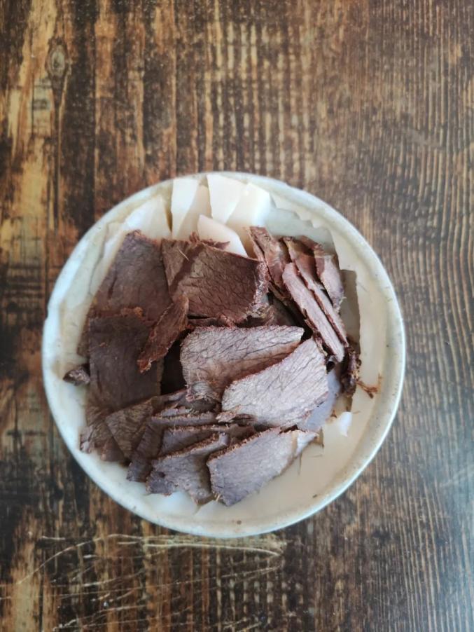 驴肉碗托。陈文俊摄荞麦糁子的碗托承载着一代又一代沙圪堵人的味蕾记忆与美食记忆,据说这记忆可以追溯到1940年。当初一个名叫苗满红的中年人因家乡河曲县被日本兵轰炸走西口来到沙圪堵定居了下来,同时也把碗托这门手艺带到了沙圪堵,后来这门手艺让他的儿子、孙子接力下来。三代人传承的是手艺,铺就了三代人的幸福生活之路。随着时间的推移,当地人也看中了这一商机,也学着卖起了碗托,大概20世纪80年代左右,碗托店也如雨后春笋般兴旺了起来,碗托由此走进千家万户饮食生活中。