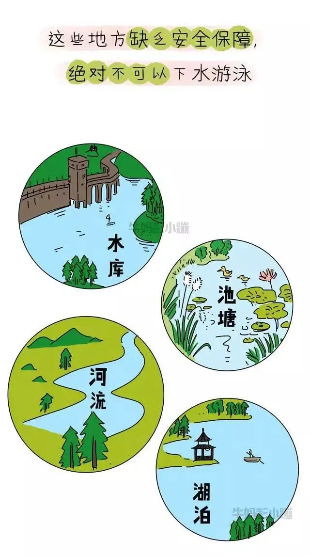 游泳要选择有安全措施的正规泳池,不可以到野外水库、江河、湖泊、未开放的海滩等危险水域游泳。