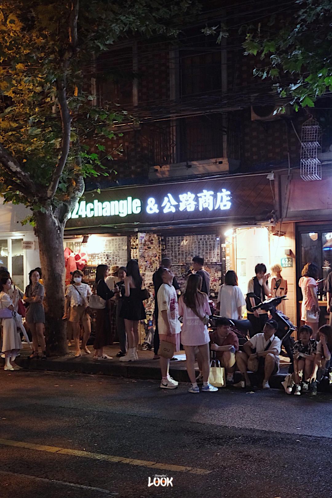 入夜后的长乐路边,624 changle&公路商店外,坐满了举着酒的年轻人,和陌生人一起坐着喝酒,就是这条街最常见的风景。
