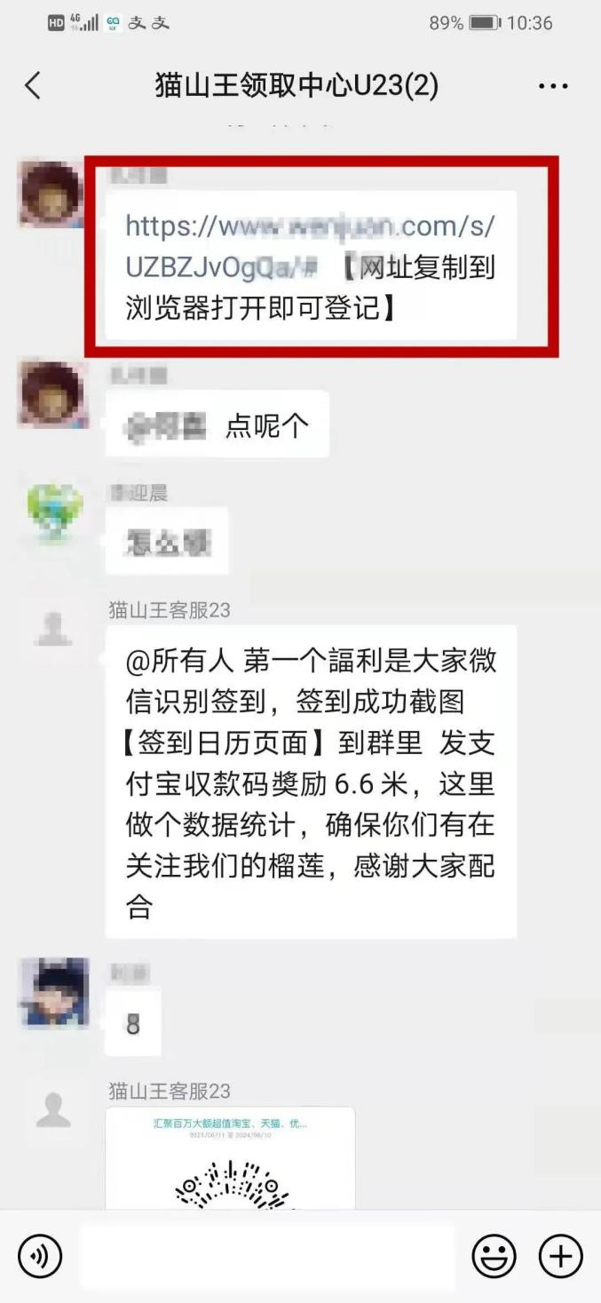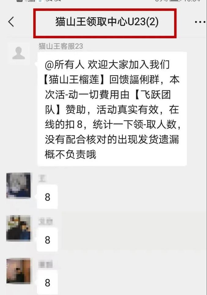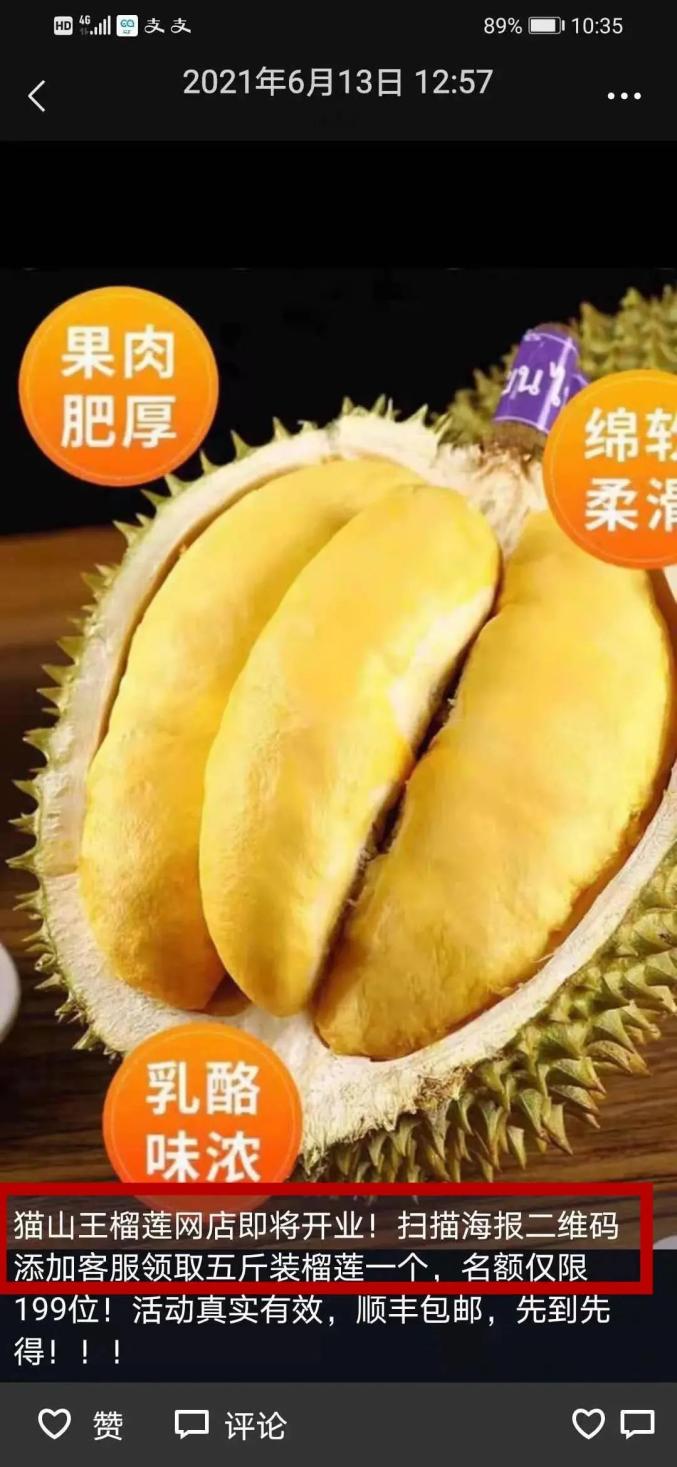 6月15日,常州市反诈骗中心接到市民李女士报警称,在朋友圈看到“免费领榴莲”的广告,于是扫码添加客服微信,被对方拉入“猫山王领取中心”微信群。