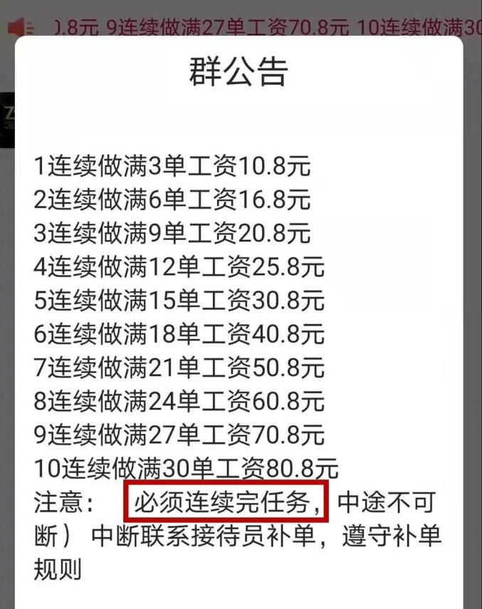 李女士跟着群里发布的要求,在微信上搜索相应公众号,点关注后截图发到群里,然后领取报酬。做了几单之后,群主称要连续完成任务,才能领工资。到这里,李女士虽然没有付出一分钱,但是几个回合的机械操作后,付出了信任和盲从。