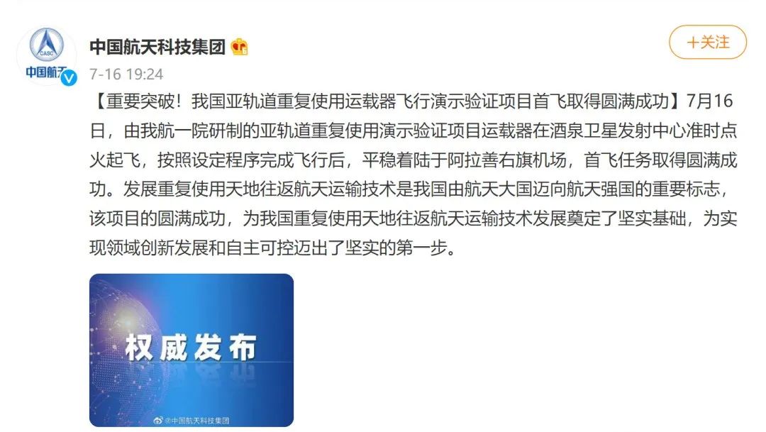 7月16日,振奋人心的消息传来:我国亚轨道重复使用运载器飞行演示验证项目首飞取得圆满成功。