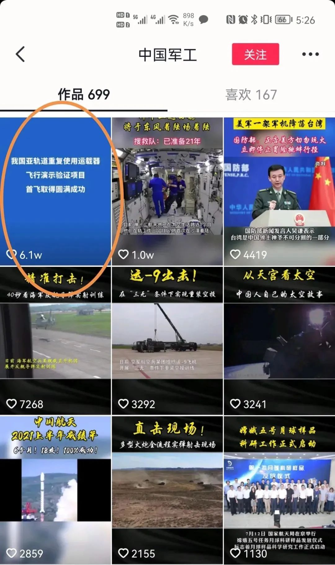据介绍,发展重复使用天地往返航天运输技术是我国由航天大国迈向航天强国的重要标志,亚轨道重复使用运载器可作为升力式火箭动力重复使用航天运输系统的子级,是航天航空技术的高度融合体。针对这则新闻信息,国家国防科技工业局新闻宣传中心抖音号“中国军工”发布了相关视频,引发数万点赞。不过视频内容只有3行文字和背景音,没有展示具体画面。