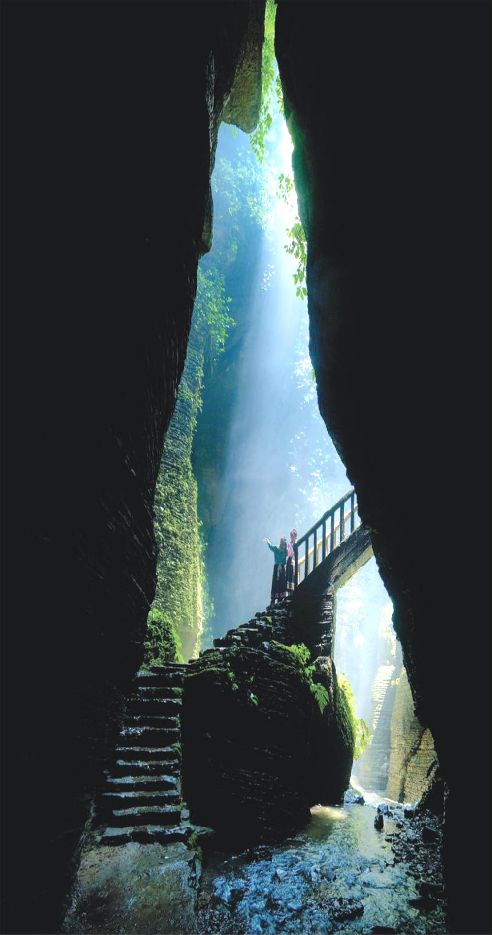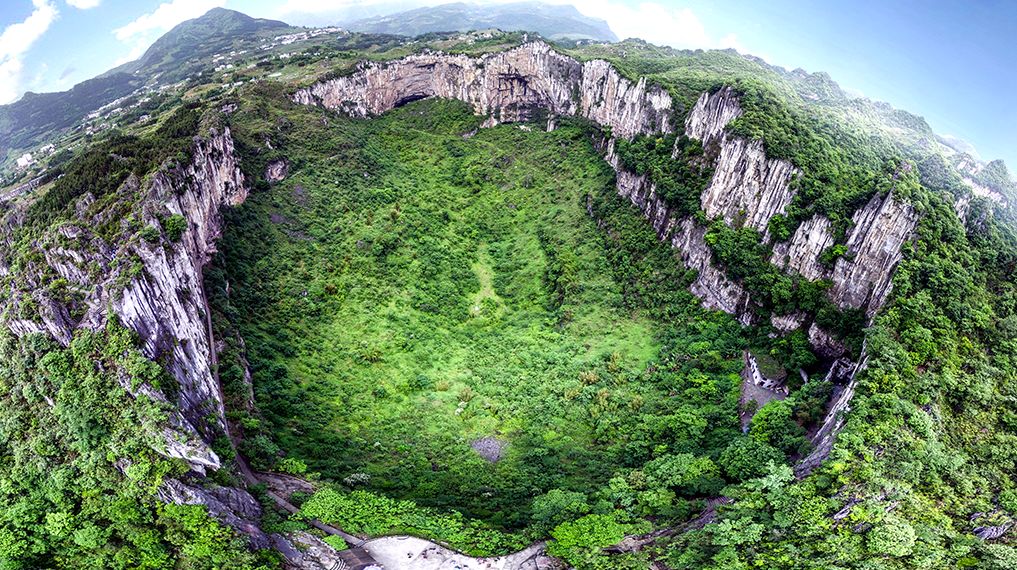 大漏斗长径650米,短径490米,深208米深盆暗底、翠竹绿树、怪石林立