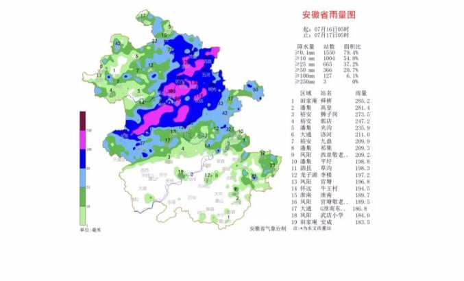 据省气象台观测,7月17日,全省大部分地区出现降水,强降水区位置阜阳、安庆和铜陵等市,17日08时到18日08时累计雨量,有374站暴雨,48个站大暴雨,最大天柱山143.6毫米。而此前,7月16日05时到17日05时,全省共计366个雨量站24小时降水量超过50毫米,127个雨量站降水量超过100毫米,最大淮南田家庵舜耕285.2毫米,为特大暴雨。