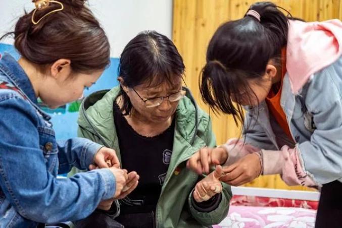 福利院孩子们帮张桂梅撕掉贴了一天的止痛胶带(2021年3月23日摄)。新华社记者江文耀摄张桂梅的右臂有一个长了多年的肿瘤,她在华坪县儿童福利院收养的女儿李光敏一直劝她做手术,可她一直不肯。“做手术要休息1个多月,老妈就是怕没她盯着,学生成绩下滑。”李光敏说。
