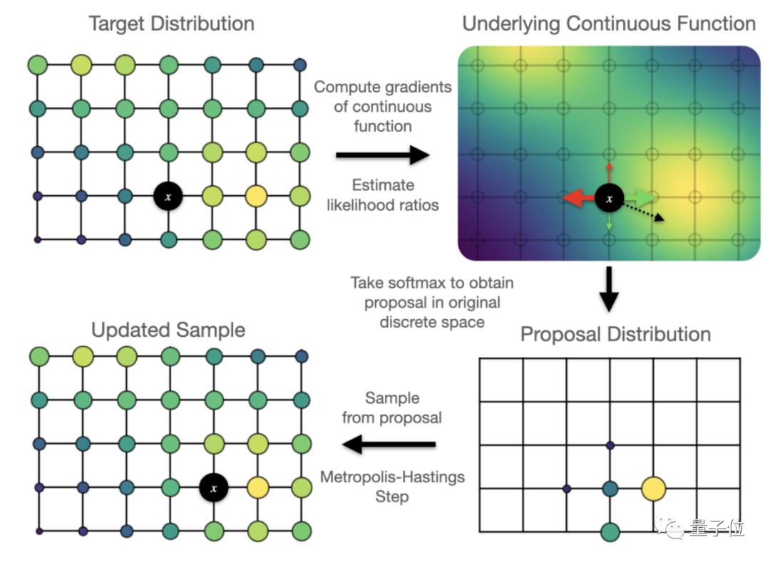 这篇论文提出了一种新的方法Direct Pred,无需梯度训练,可以直接根据输入的统计信息来设置线性预测。在ImageNet上,它与更复杂的BatchNorm预测器性能相似。这项研究提供了非对比SSL方法如何学习的概念性简介,以及预测网络、停止梯度、指数移动平均数和权重衰减等因素如何发挥作用。3、Oops I Took A Gradient: Scalable Sampling for Discrete Distributions