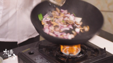 锅子里先放油,油烧热之后,放入50克咸肉,再加2味新鲜食材——0.5个洋葱、3个香菇一同炒制,直到洋葱、香菇微微熟透即可~