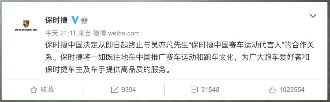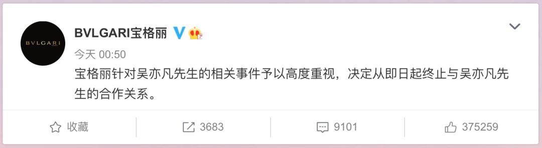 7月20日凌晨,宝格丽发布消息称,决定从即日起终止与吴亦凡的合作关系。