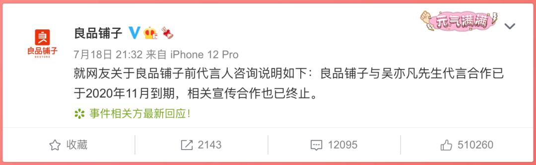 此前,已有十多家品牌与吴亦凡终止或暂停合作,包括韩束、良品铺子、云听app、立白、滋源、兰蔻、华帝、得宝、康师傅冰红茶、王者荣耀、腾讯视频、乐堡啤酒、保时捷和LV。