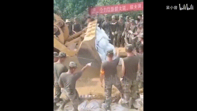 铲车放下抗洪沙袋的瞬间战士们一拥而上扛起沙袋训练有素地冲向人工堤坝不断用沙袋垒高、垒实