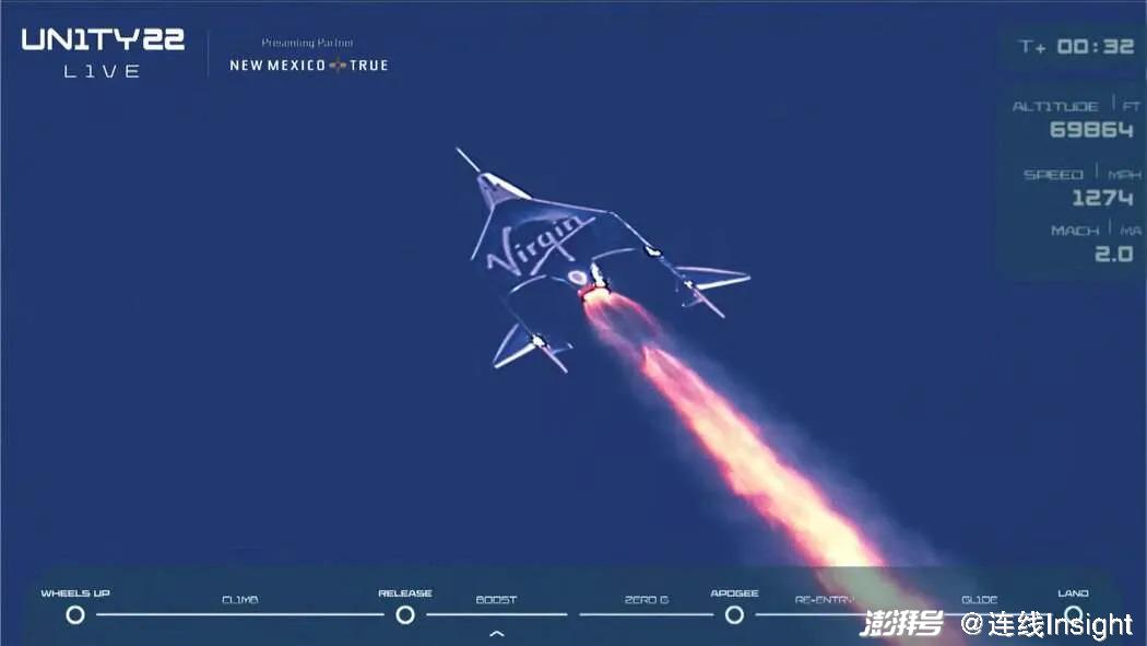 维珍银的太空飞机“团结”号点燃火箭,图源直播视频