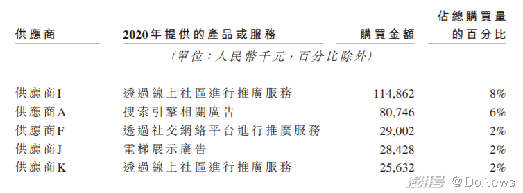 另外,在雍禾医疗的招股书中,其罗列出来的前五大供应商均为广告服务提供商,所提供的广告渠道包括线上社区、搜索引擎、网络社交平台和电梯展示。
