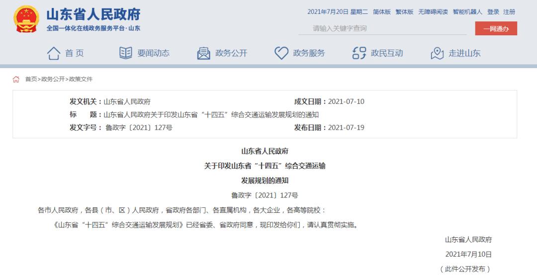 双开!批捕!游园提升改造!听听你的建议!7月19日,山东省人民政府网站发布《山东省人民政府关于印发山东省“十四五”综合交通运输发展规划的通知》。