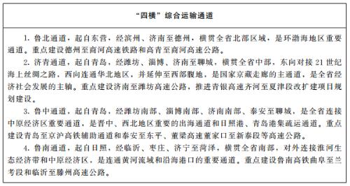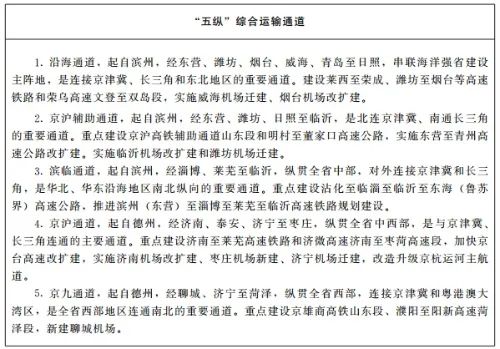 1.完善四横五纵通道。积极融入国家京津冀—长三角主轴、京哈走廊和京藏走廊。在基本形成鲁北、济青、鲁南三个横向通道基础上,加快完善鲁中横向通道,提升沿海港口辐射能力和西向铁水联运效能,积极融入共建“一带一路”高质量发展;在基本形成沿海、京沪辅助、京沪、京九四个纵向通道基础上,加快完善滨临纵向通道,强化与京津冀、长三角区域连接。
