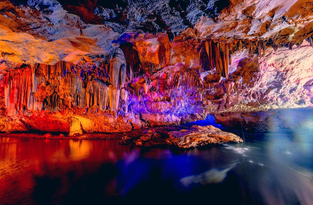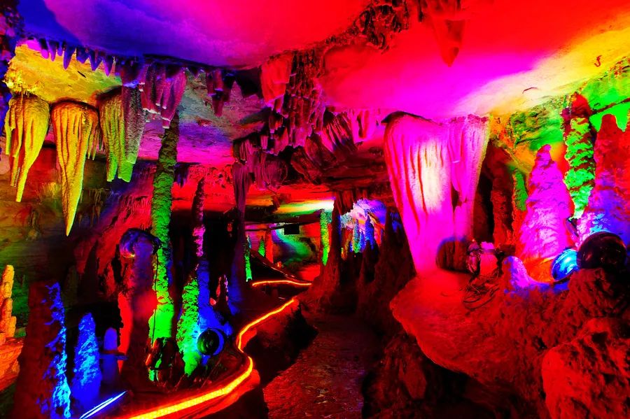 新颖独特的三种游览方式更是令人可近距离感受大自然的神奇。上游1/3乘船,中游1/3坐小火车,下游1/3步行,整个旅途轻松又愉快。洞内处处有水,水水均清,水面波光粼粼,水下暗流涌动,在灯光的照眏下色彩斑斓,倒影成趣。Tips: