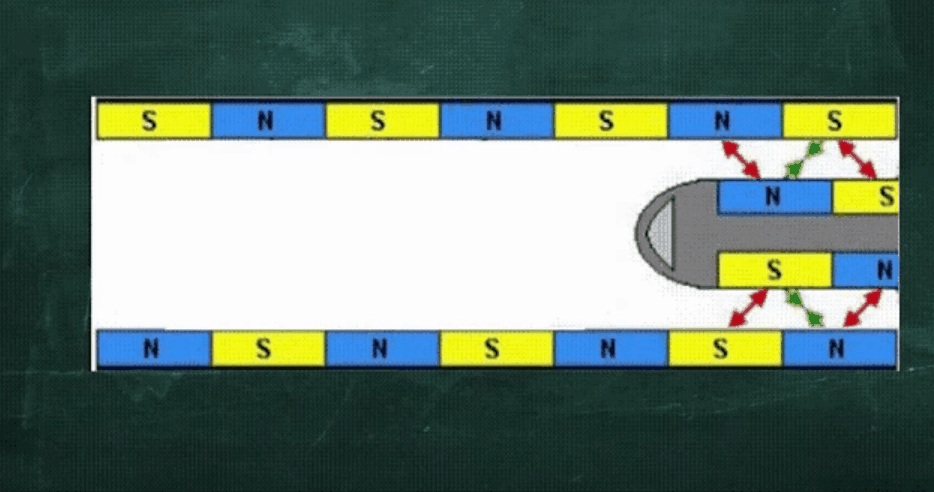 那么浮起来以后,它又怎么往前进呢?拿我们最常见的磁浮驱动形式为例,就像下面这个 GIF 图演示的,通电以后轨道会变成一段段带有 N 极和 S 极的电磁铁,车上的 N 极和轨道 N 极碰到,车就会被往前推,N 级和 S 级碰到,车就会被相应的往前拉。