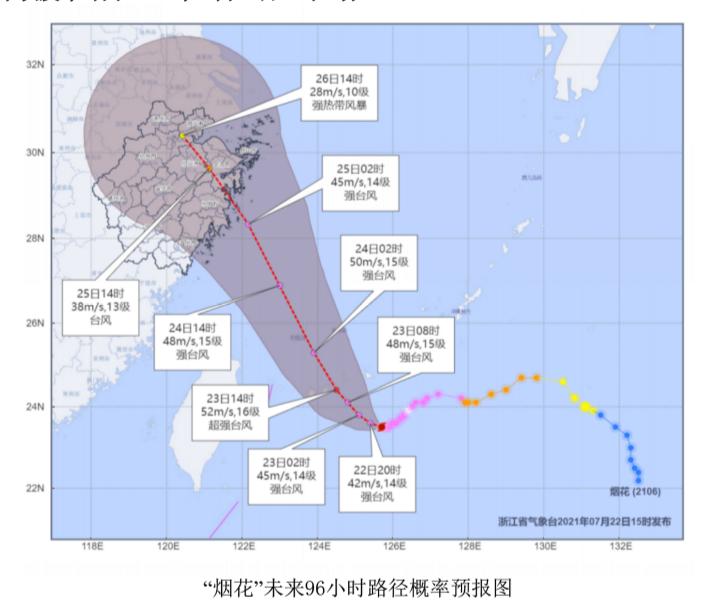 预计“烟花”将以每小时5公里左右的速度向偏西方向移动,强度逐渐加强,23日中午前后移入东海东南部海面,逐渐向我省沿海靠近。将于24日夜里到25日白天在浙江沿海登陆,最大可能在浙中北一带沿海登陆(登陆级别为强台风级或台风级),目前还不能排除在浙江近海海面北上的可能。按照《诸暨市防汛防台抗旱应急预案》,市防指决定于22日14时启动防台风Ⅳ级应急响应,同时启动地质灾害Ⅳ级应急响应。