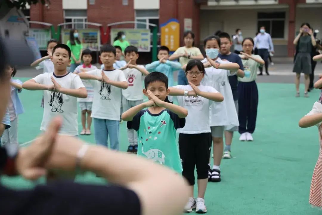 在汇师小学分校的操场上,响亮的口号声传来,徐家汇街道爱心暑托班2班的学生正在上武当一炁五行拳,他们跟着教练学一招一式,习得武术的礼仪、基本动作,感受传统武术的魅力。