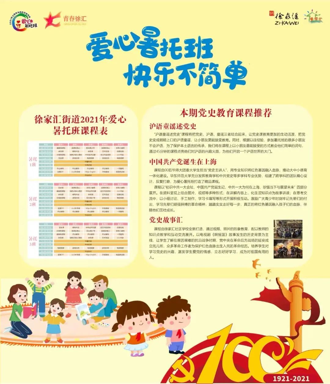 今年是徐家汇街道开办暑托班的第8个年头,火热程度有增无减。今年用微信公众号线上报名的方式取代了现场报名,让报名更加快捷、方便。课程丰富多彩,有社区学校配送的党史故事汇、书法、绿色环保小课堂、沪语童谣讲党史,也有来自徐家汇区域单位优秀青年组成的青年志愿者讲师团为大家带来的各类种类繁多的兴趣类课程。