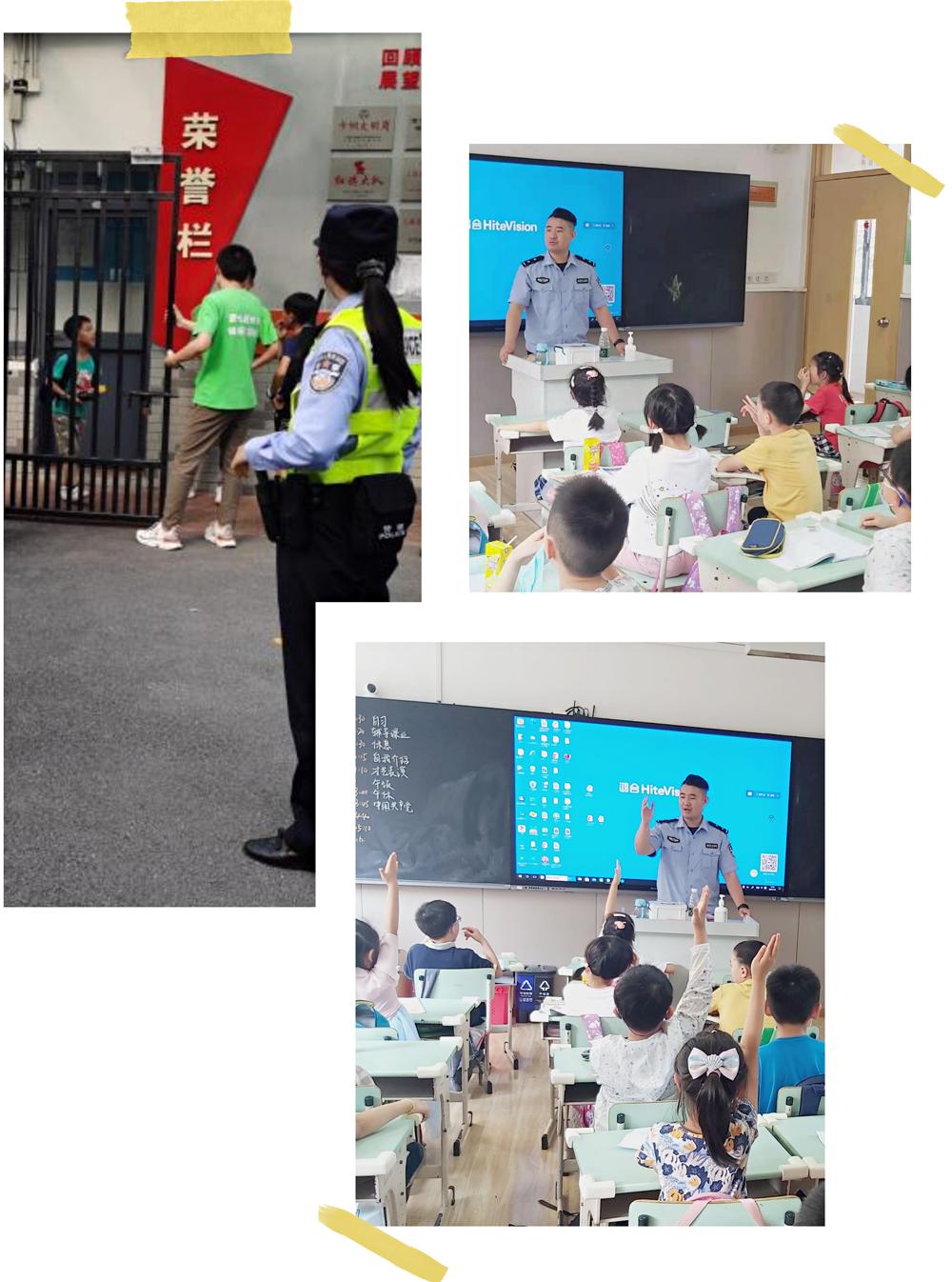 7月5日开班上午,警察在校门口帮忙协助维持秩序;当日下午,走进课堂,给小朋友们强调了交通安全,上下学路上注意安全;在遇到危险之后,要及时告诉家长,积极寻求警察的帮助,为小朋友们的安全护航。