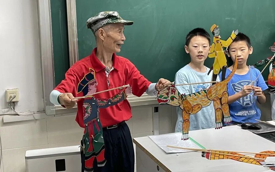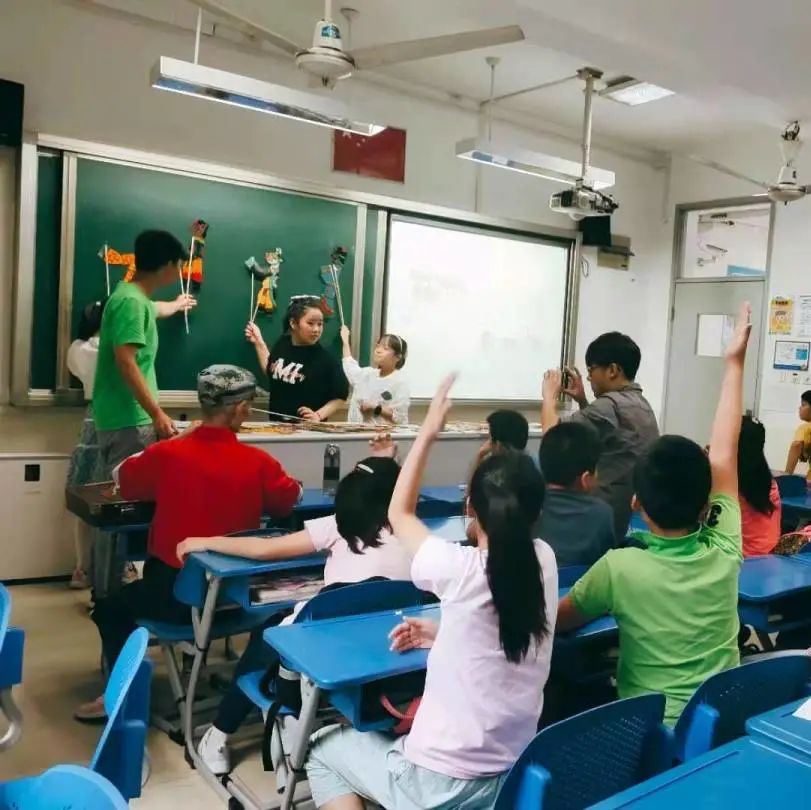 康健桂林班皮影作为上海皮影的典型代表,蕴含着丰富的海派文化,至今已有百年历史,是康健本土璀璨的文脉瑰宝。康健桂林皮影戏从光绪年间传承至今,已至第五代传承人。为开阔孩子们的视野,暑托班特别邀请皮影艺术家沈老先生进行皮影戏的历史讲解和表演,让大家身临其境地感受皮影戏的魅力。在沈老先生的手中,一幅幅形象逼真、传神、富有神韵的皮影戏舞动了起来,小朋友们全神贯注、目不转睛地欣赏着这一美妙的民俗艺术。在课程中最为高潮的体验环节,孩子们对传统民俗的求知欲高涨,他们自由地操作着皮影戏,笑容洋溢在他们的脸上。