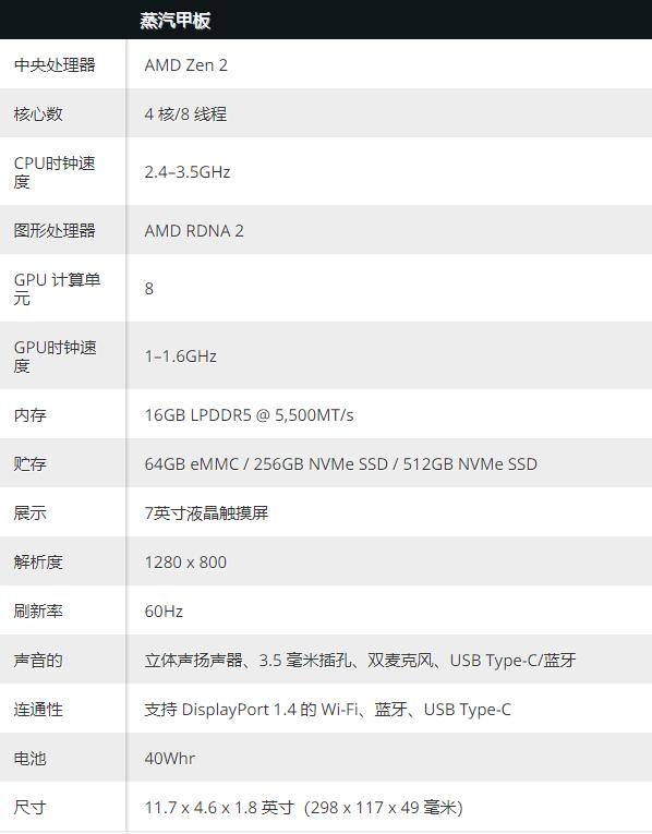 另外这台掌机还配备了 7 英寸 1280 × 800 分辨率的液晶触摸屏,以及一个官方外接的显示器底座,具体配置差友们可以参考下面这张表格。