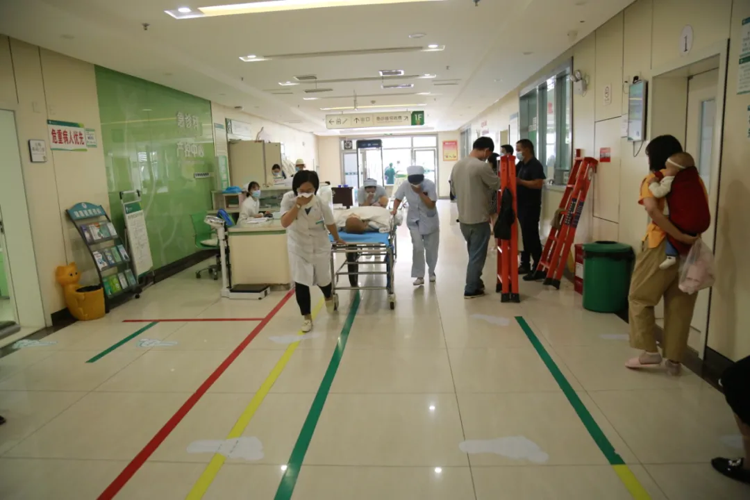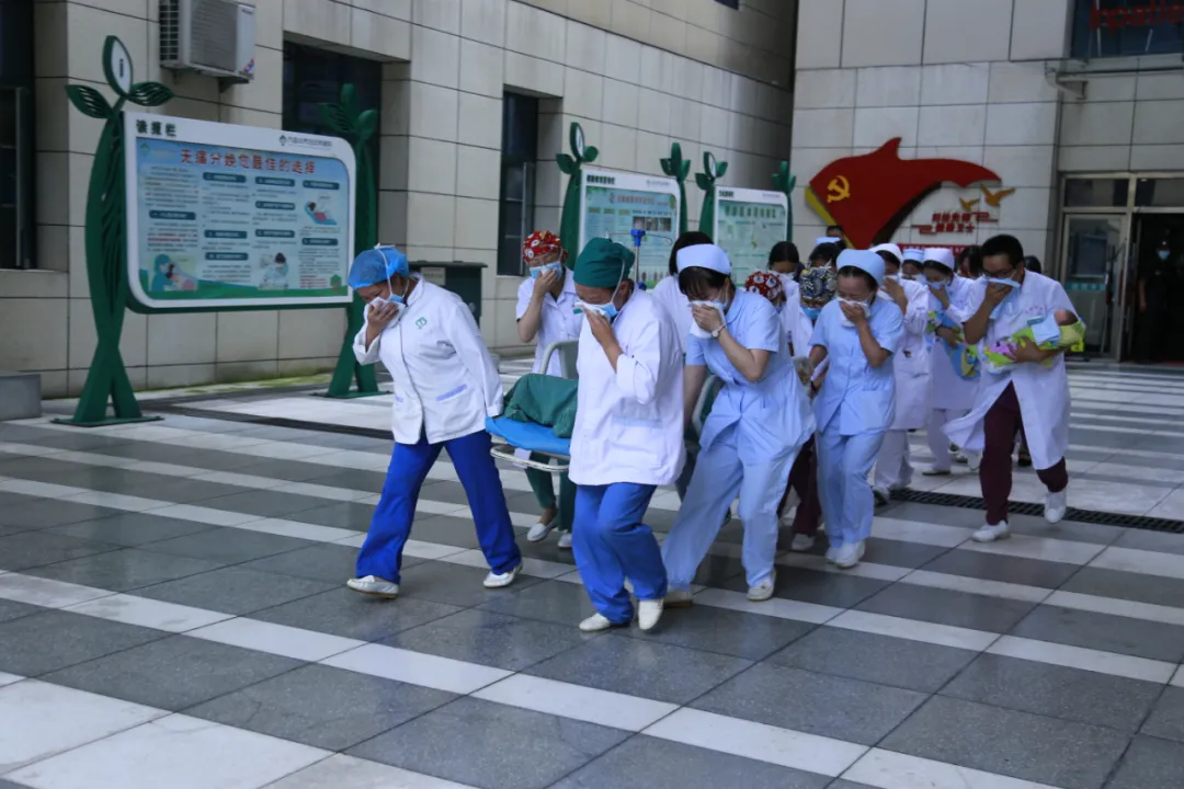 医院医护人员立即启动应急预案,组织人员把病员和贵重物资、易燃、易爆物品,按水平疏散方法疏散到同一层安全防火区。