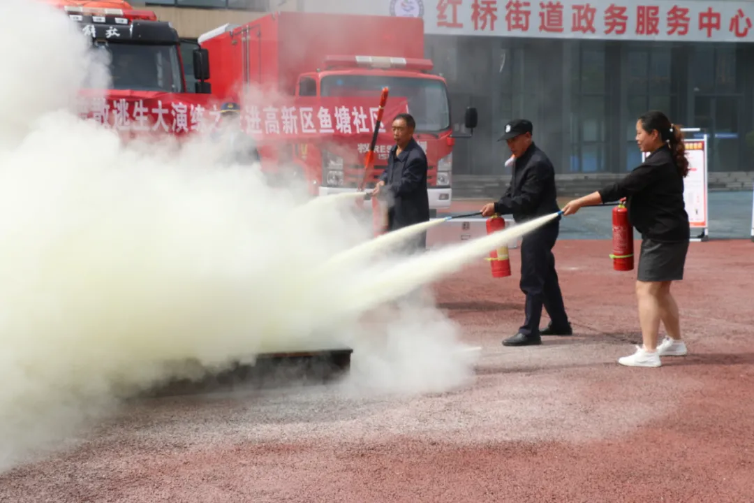 高新区消防大队组织高新区鱼塘社区共计200余人参加演练。此次演练在国镔超市、扶贫工厂、社区4栋4单元等地同时进行。
