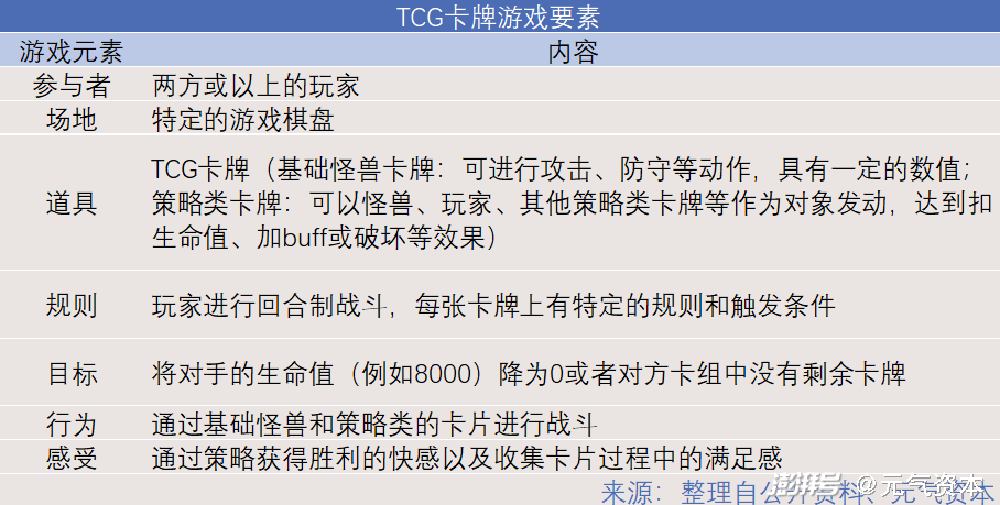 为了更加清晰地说明TCG卡牌行业的价值链,有必要对其玩法和规则进行简单介绍,下表罗列了TCG卡牌游戏基本要素。