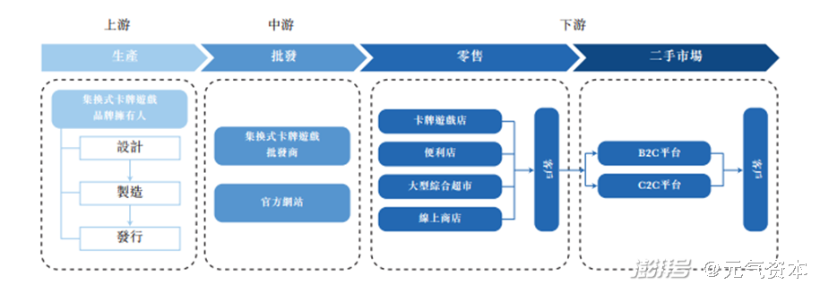 生态中的主要参与者包括上游的品牌拥有人(即IP方)、中游的卡牌批发商及官方网站、下游的便利店等终端和消费者以及二手市场。