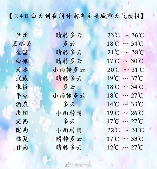 据预报,7月24日,兰州市区晴转多云,23℃-36℃。25日多云转阵雨,23℃-34℃。26日中雨转小雨,20℃-29℃。
