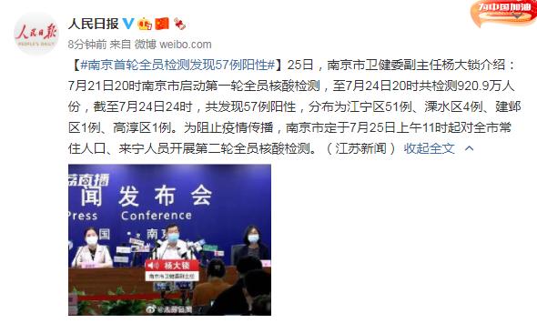 据江苏新闻,7月25日,南京市卫健委副主任杨大锁介绍:7月21日20时南京市启动第一轮全员核酸检测,至7月24日20时共检测920.9万人份,截至7月24日24时,共发现57例阳性,分布为江宁区51例、溧水区4例、建邺区1例、高淳区1例。为阻止疫情传播,南京市定于7月25日上午11时起对全市常住人口、来宁人员开展第二轮全员核酸检测。