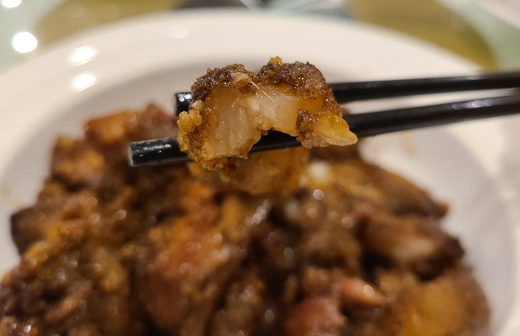 肥肉不腻丨拍摄 呲呲粉蒸肉整体来说,肥肉比瘦肉好吃,肥肉已经软烂到吃不出油腻,但瘦肉部分却带着一股说不清道不明的腥味,要是连皮带肉一块吃下,那股浓重的味道,可能需要几分钟时间来缓一缓。